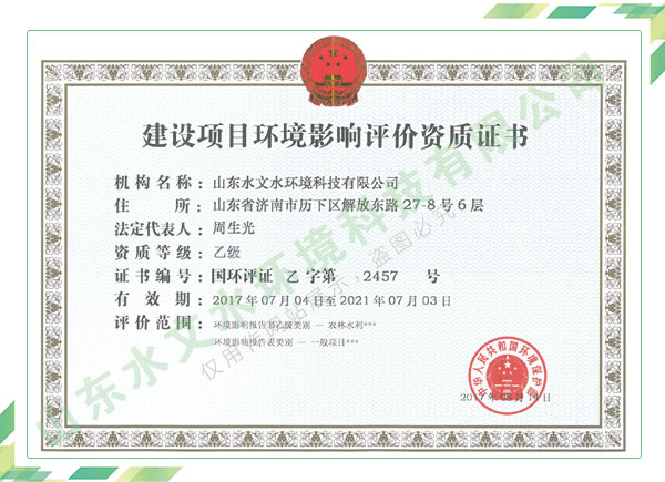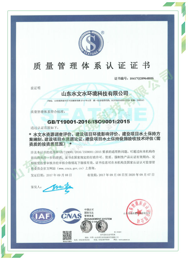 公司擁有水利工程設計、水土保持、水文水資源調查評價、水資源論證、建設項目環境影響評價、市政公用工程施工總承包、水利水電工程施工總承包、電子與智能化工程專業承包等資質,2017年通過質量管理體系、環境管理體系、職業健康安全管理體系認證;2020年被評為國家級高新技術企業,同年被中國水利企業協會推薦為第一批“合同節水服務企業”;2021年被山東省、濟南市評為 “專精特新”中小企業。業務范圍涉及水利工程設計;節水設計、改造、水平衡測試;山洪災害調查;城市水資源調查評價;建設項目水土保持方案編制、監測、驗收、水土保持規劃;水安全保障規劃、建設項目水資源論證、規劃水資源論證;建設項目環境影響評價;入河排污口論證;防洪影響評價;市政公用工程施工、水利水電工程施工、電子與智能化工程施工等。